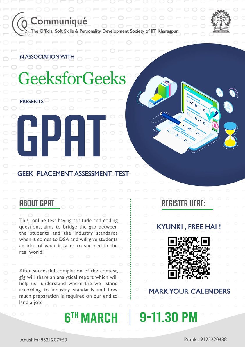 After the astounding performance by KGP Community in Johnson and Johnson's Crackathon, Communiqué is back with another challenge - Geek Placement Assessment Test (GPAT) in association with GeeksforGeeks, free of cost contest designed to test our skills against industry requirements for all KGPians. The test covered Logical Reasoning, Quantitative Ability and Programming Logical and Theoretical.