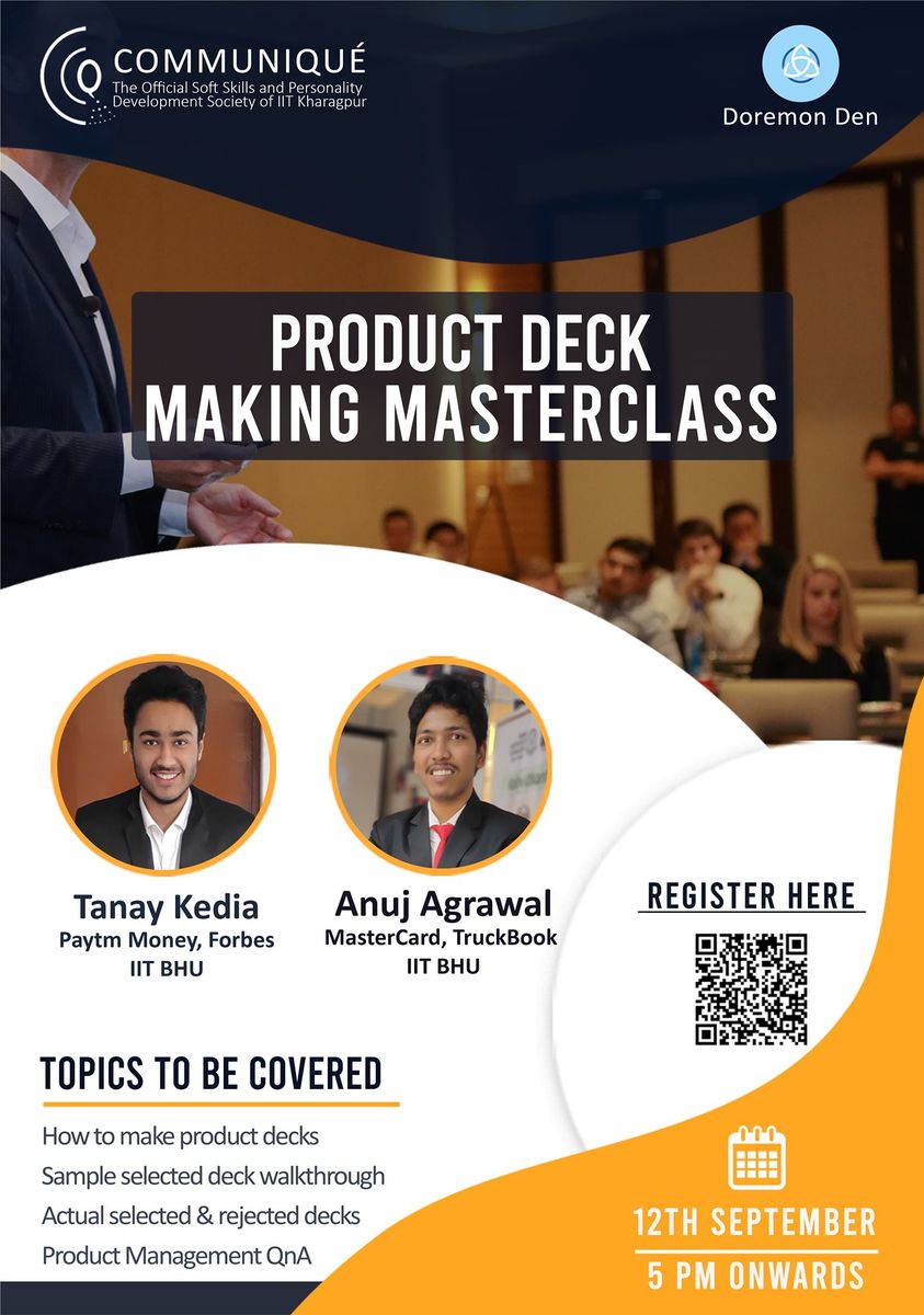 Communiqué IIT Kharagpur organized a session Product Deck Making MasterClass in collaboration with Doremon Den, which covered "actionable steps" to make a deck required for Case Study Assignments in most placements and Internships product roles.
